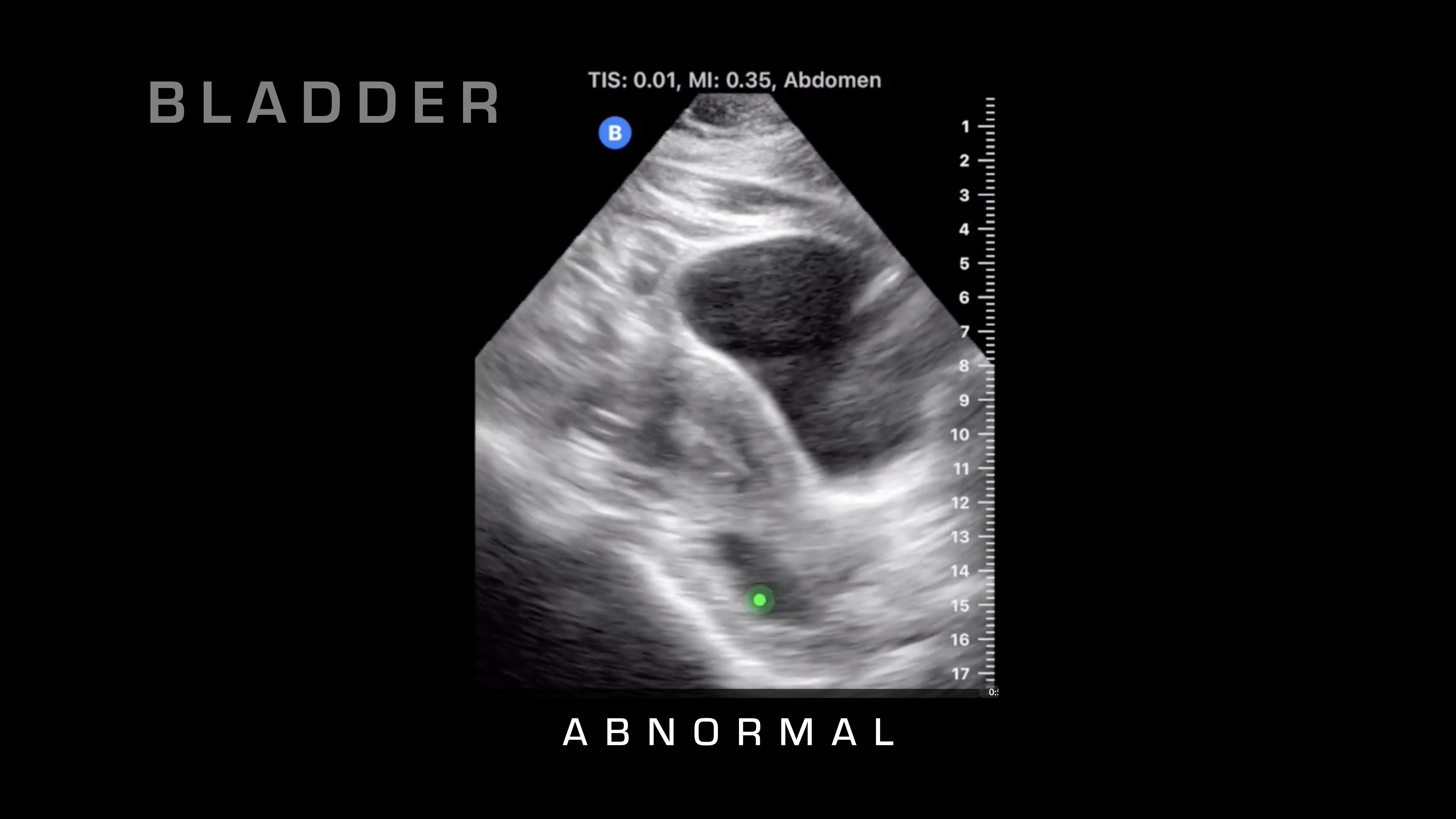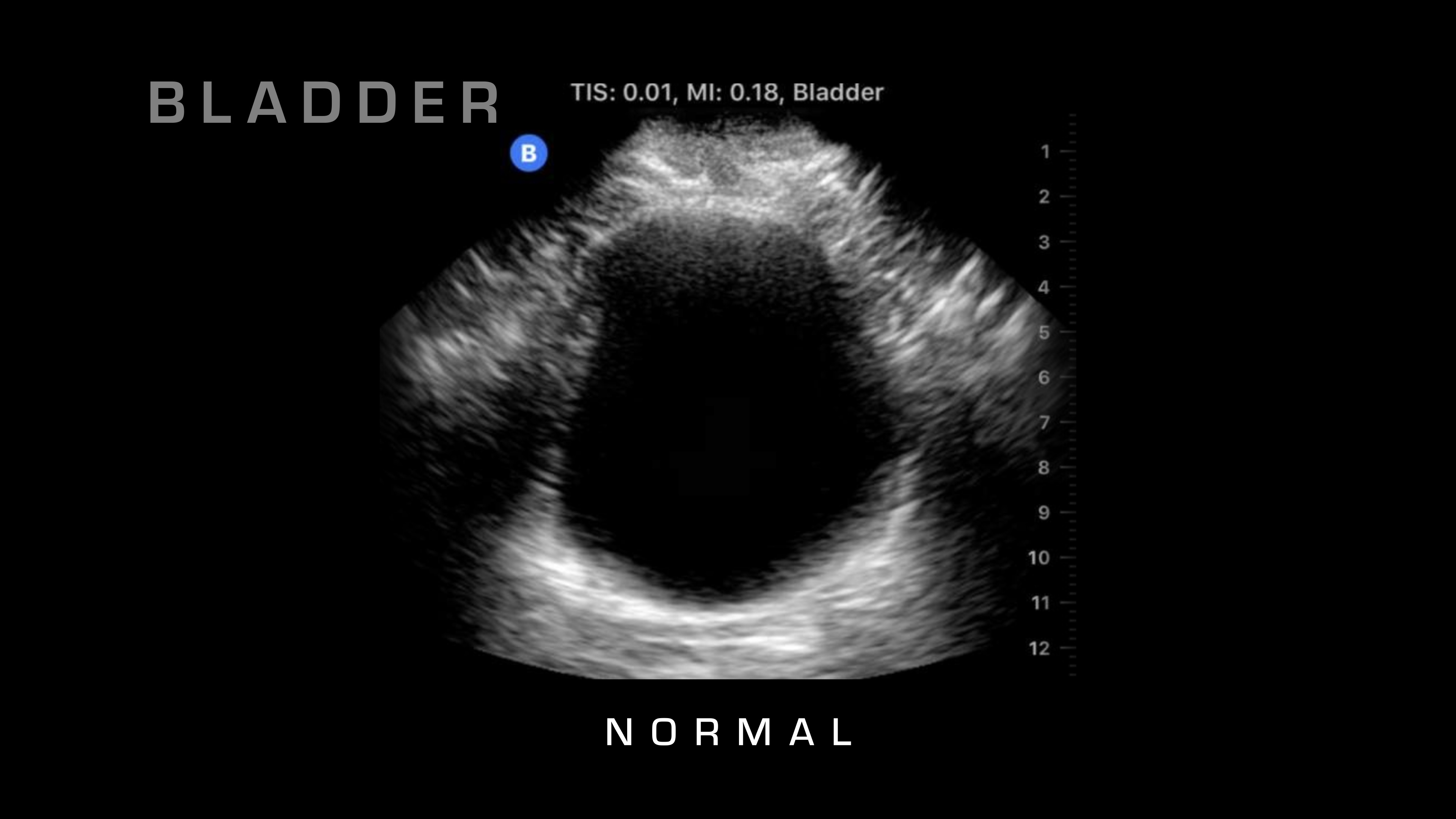 The next spot that I'm going to go to is it's going to be super pubic, so I'm going to go just over the pubic symphysis, and I'm going to angle basically straight down. What we're looking at here is we're going to see a large, fluid-filled structure that's going to be the bladder. We're looking for blood that is surrounding that, so either on the sides or if we penetrate all the way through the bladder, then we can take a look.