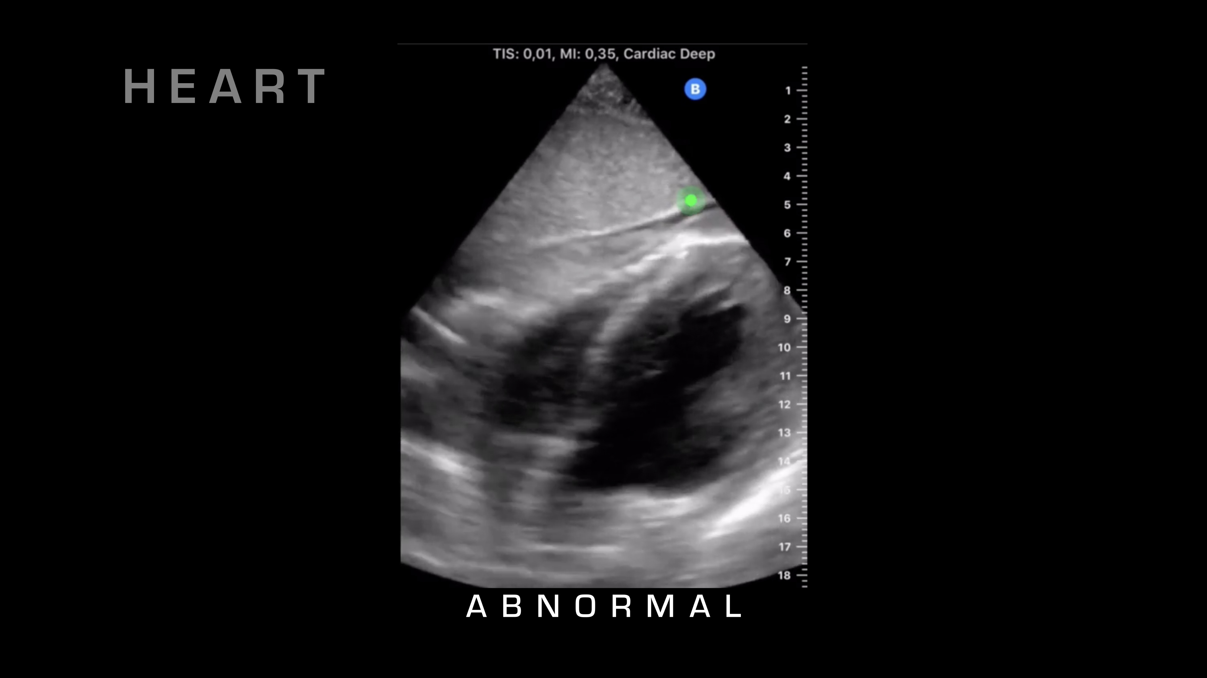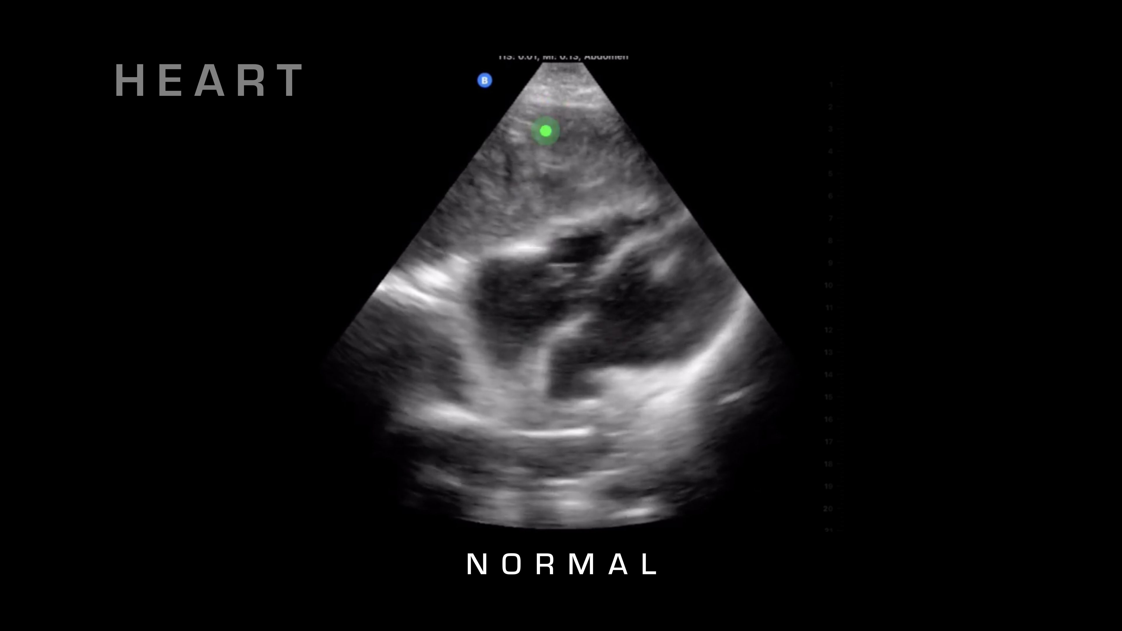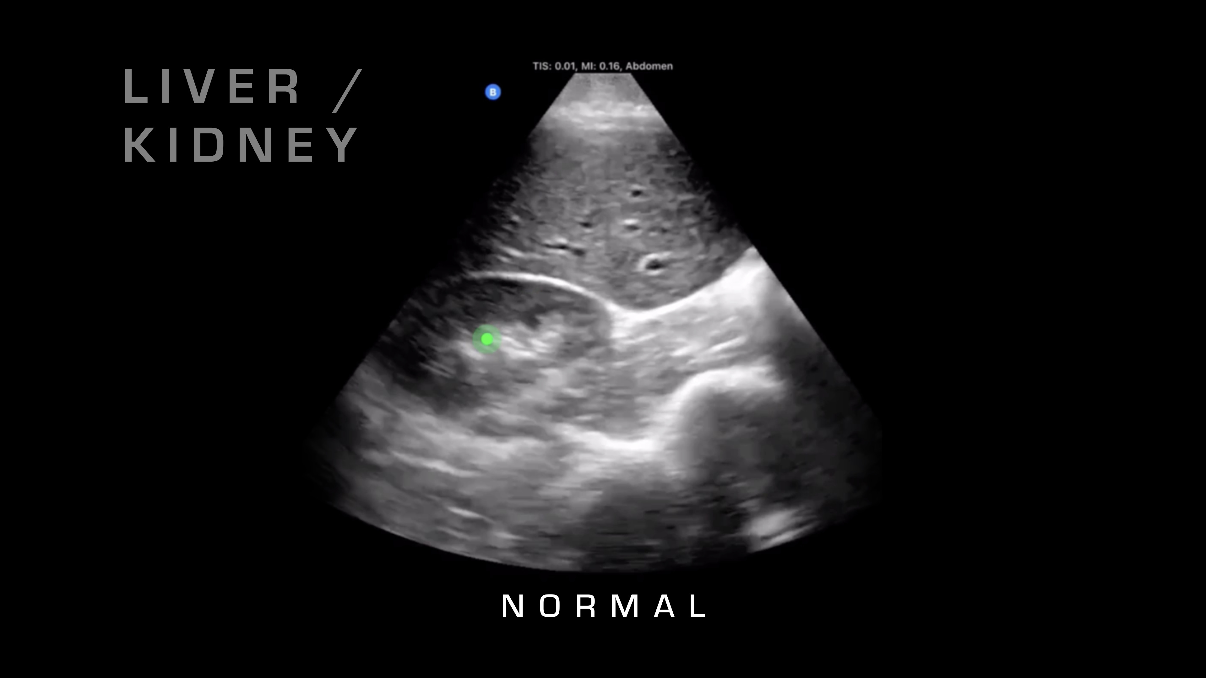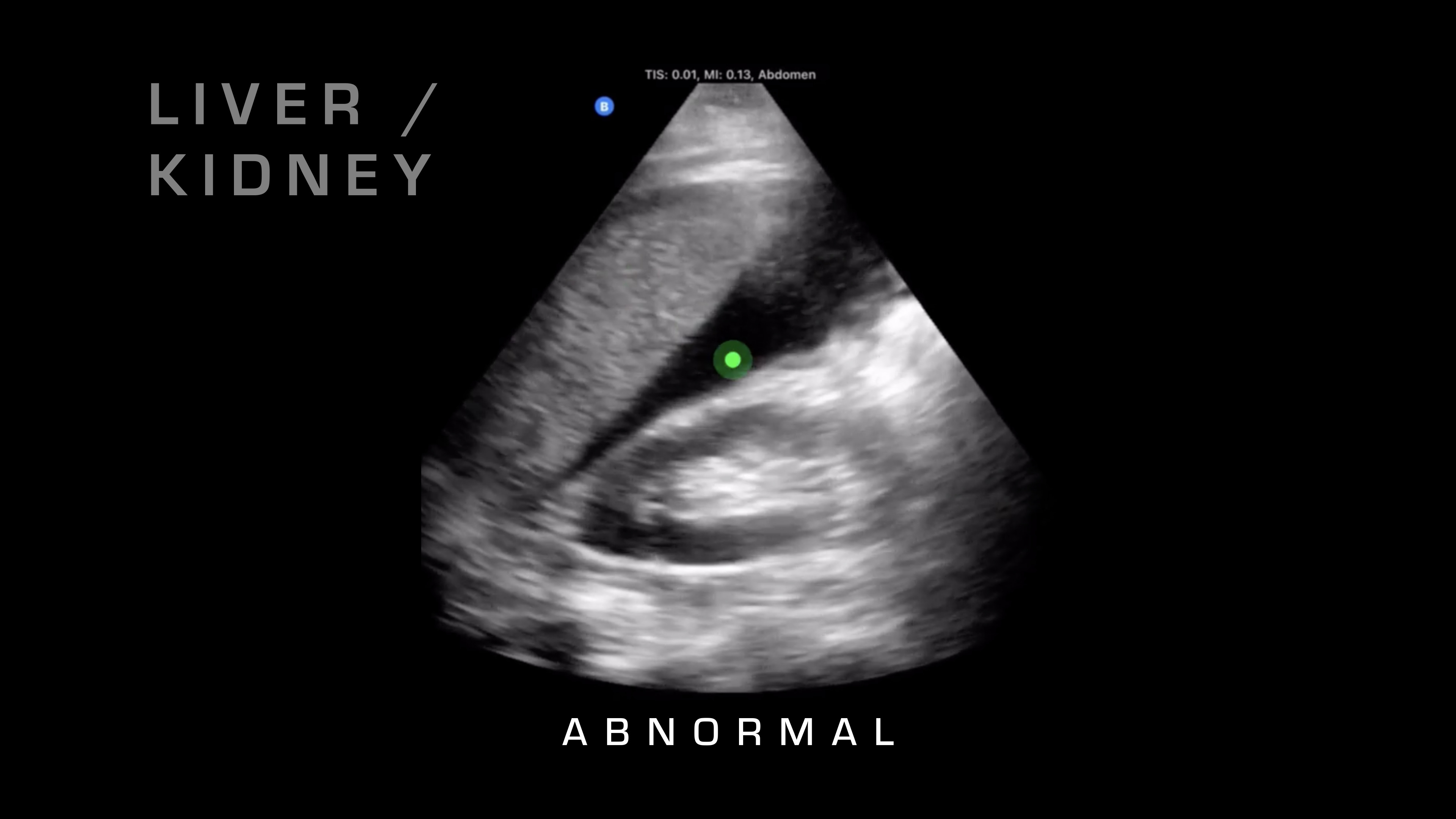 If I want to go superficial, I'll swipe it down. If I want to go deeper, I'm going to swipe up and take a look. Next up, I'm going to go over on the right side of the patient, and what I'm going to be looking for is the liver and where that interfaces with the kidney. So there's a potential space there that shouldn't have any fluid between it, and if you see fluid between it, as you can see on this video here, then that's blood in the abdomen. So you know your patient is bleeding internally. That's obviously a risk for hemorrhagic shock, and that would warrant resuscitative care and rapid evacuation.
