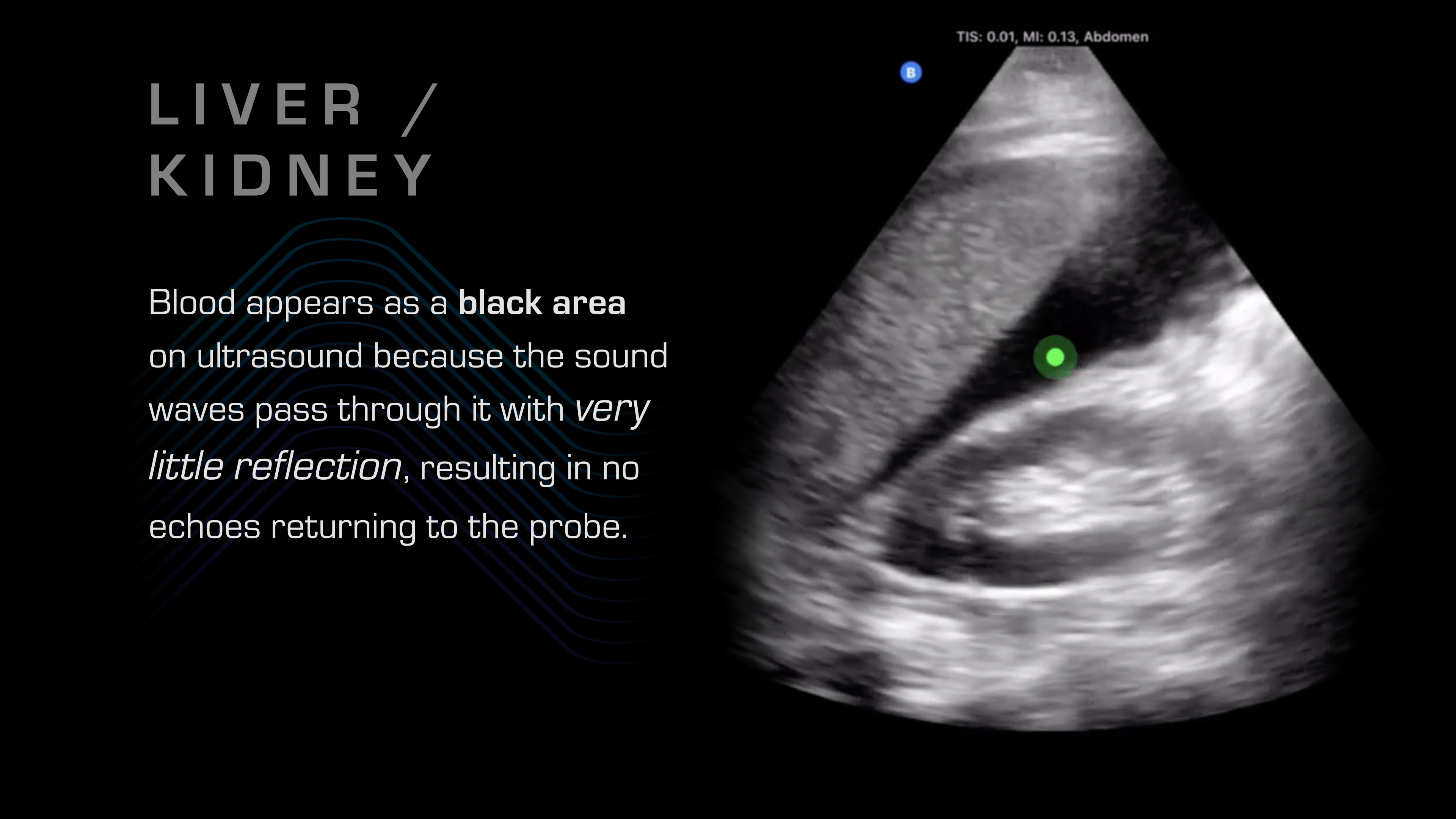 So what does blood in the abdomen look like? Blood looks like a black spot because, as the ultrasound waves penetrate through, it travels with minimal reflection, so it's just going to look like a black spot.