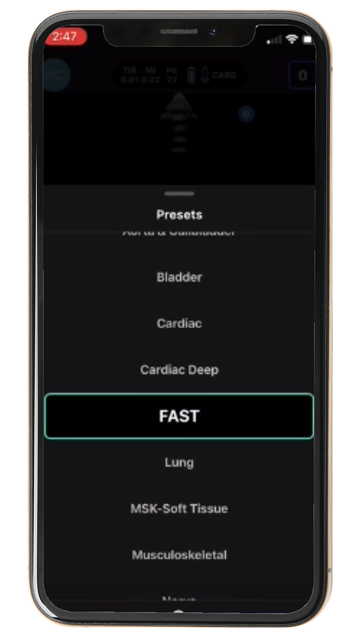 Very simple exam to learn. Takes a few practice runs, and then you're able to identify hemorrhage within the abdomen. So I'm going to focus on the abdominal portion of the FAST exam today. We're going to make sure that we've got our probe connected. Takes about two seconds to connect. We'll go to presets, and I'm going to put it on FAST. Make sure I've got gel on mine.