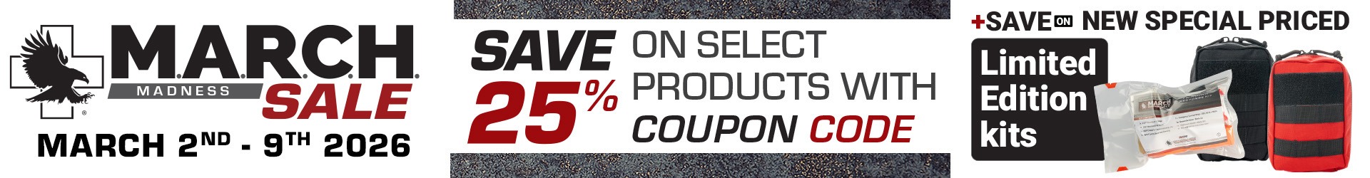 The NAR M.A.R.C.H. (Massive Hemorrhage, Airway, Respiration, Circulation, and Hypothermia/Head Injury) Madness Sale begins now with deals on life-saving products! Shop select kits and gear with coupon code MARCH* to get 25% off!