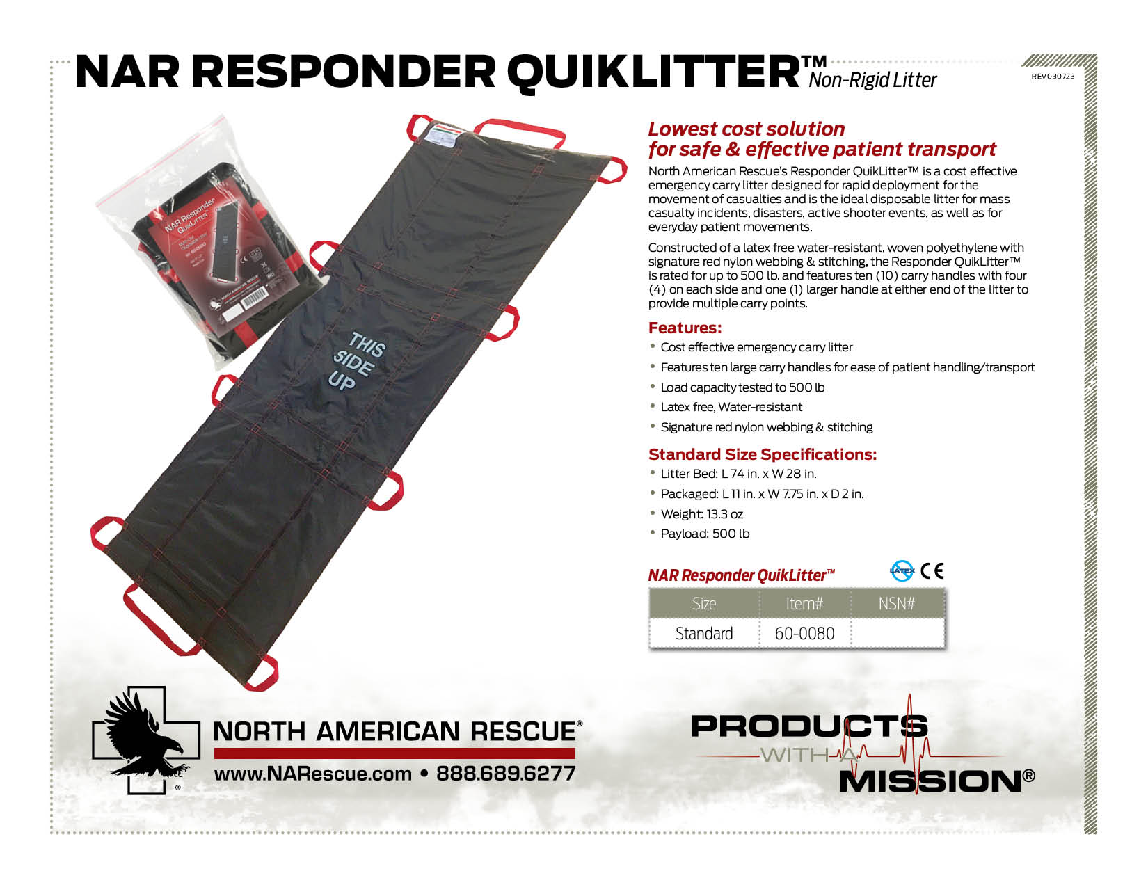 North American Rescue's ELITE Responder Litter is a cost effective emergency carry litter designed for rapid deployment for the movement of casualties and is the ideal disposable litter for mass casualty incidents, disasters, active shooter events, as well as for everyday patient movements. Constructed of a latex free water-resistant, woven polyethylene with signature red nylon webbing & stitching, the NAR® ELITE Responder Litter is rated for up to 500 lb. and features ten (10) carry handles with four (4) on each side and one (1) larger handle at either end of the litter to provide multiple carry points.