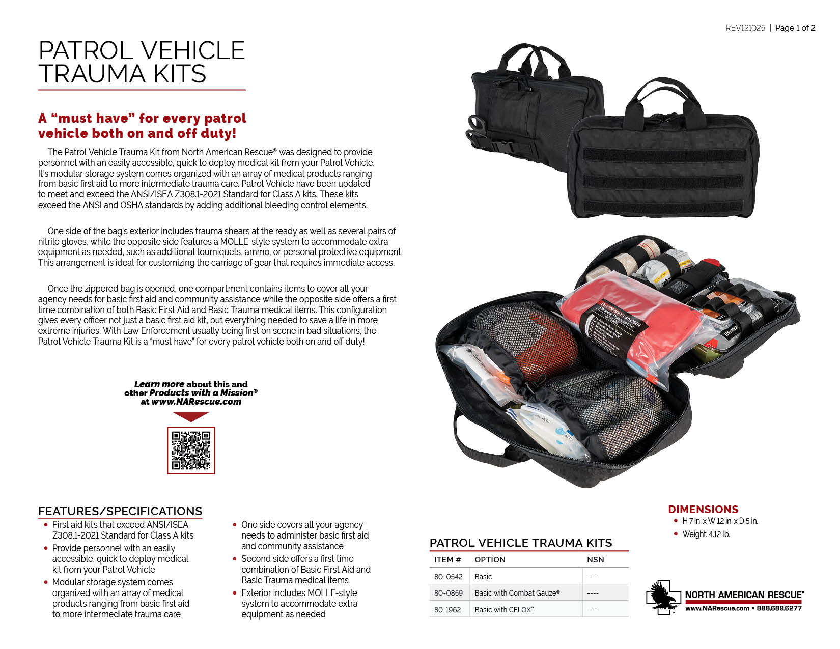 The Patrol Vehicle Trauma Kit from North American Rescue® was designed to provide personnel with an easily accessible, quick to deploy medical kit from your Patrol Vehicle. Its modular storage system comes organized with an array of medical products ranging from basic first aid to more intermediate trauma care.